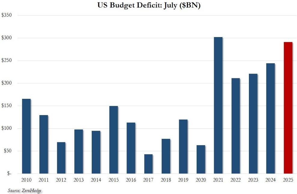 與通膨數據同時公佈的財政報告更為嚴峻。7月美國聯邦政府支出暴增9.7%,達6,300億美元,創1月以來次高;收入僅成長2.5%至3,380億美元,其中包含193億美元關稅收入(若剔除關稅,收入實則較去年同期下滑)。收支失衡導致7月財政赤字飆升至2,910億美元,較去年同期擴大20%,為史上第二高7月赤字。截至7月,本財年累計赤字已達1.629兆美元,較去年同期成長7.4%,2025財年大機率成為美國史上第三大赤字年份。