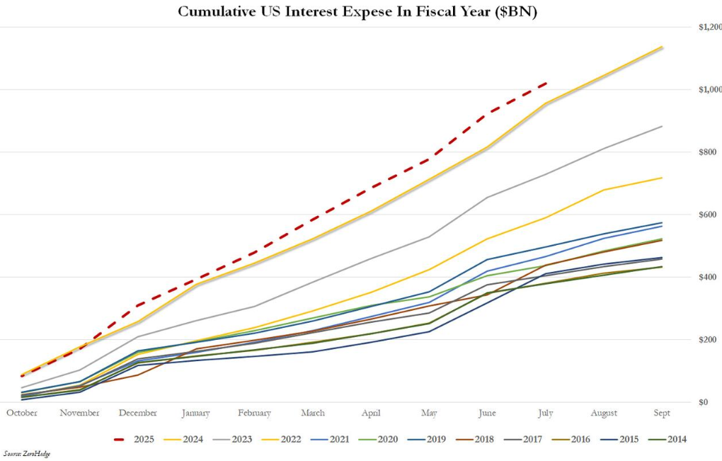 更嚴峻的是,美國公債總額首次突破37兆美元,約2024年名目GDP的1.27倍;7月單月利息支出達919億美元,前十個月累計突破1.019兆美元,全年或超1.2兆美元,穩居聯邦第二大支出,僅次於社會安全。儘管關稅收入連續四月高點運作(7月約193億美元,年化約2,400億美元),但面對近10%的支出增幅,這點收入杯水車薪,難以扭轉財政惡化趨勢。