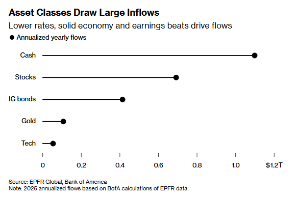 根據美國銀行基於EPFR Global 數據的計算(按年化),2025 年,股票、現金、黃金與投資等級債券的資金流入規模都將名列前茅。股票基金流入或達6,930 億美元,排歷史第三;現金類基金預計吸金1.1 兆美元,為歷史第二;黃金和投資等級債券將分別迎來1,080 億美元與4,150 億美元資金,均創歷史新高。