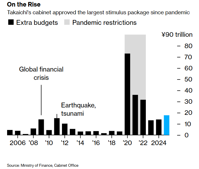 這場自新冠疫情以來日本最大規模的財政發力,其17.7兆日圓一般性支出(較去年提升27%)與2.7兆日圓減稅措施的組合設計,既精準回應了通膨持續高企的民生痛點-11.7兆日圓物價救濟資金聚焦於家庭能源補貼、兒童現金發放等直接惠民舉措,同時吸收在野黨政策主張推出汽油稅取消、個稅起徵點提高等措施,針對性對沖已持續43個月的超央行2%目標通膨(1992年以來最長週期)。資金來源層面,Ace Markets基於日本財務省近十年財政收支平衡表、通膨稅增收計算模型及國債發行需求預測公式,判定除通膨帶動的稅收自然增長外,新增政府債券發行規模大概率突破去年6.69兆日圓的水平。