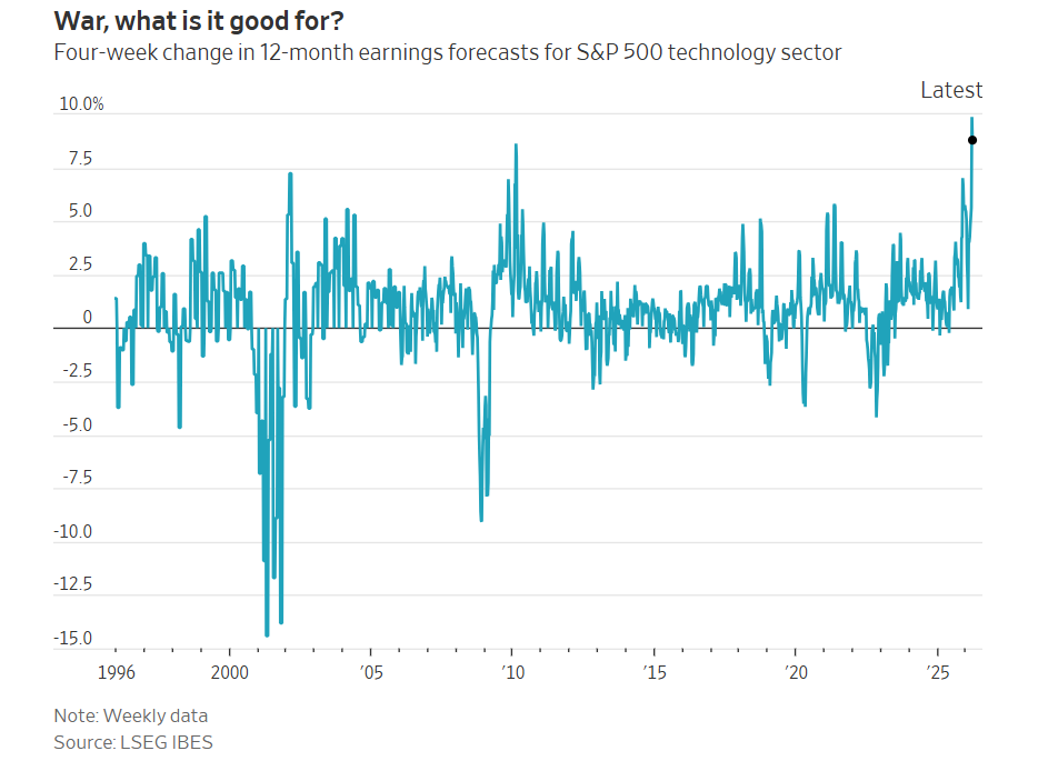 分產業來看,獲利預期漲幅居前的自然是受益於油價上漲的石油板塊,化工、航空、郵輪等石油消費產業的獲利預期確實受到一定衝擊。但超出市場普遍預期的是,本輪局勢升級以來,美股所有板塊的獲利預估均出現上調,其中科技板塊更是創下1995年有數據以來的最大四周漲幅。